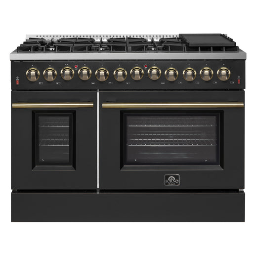 FORNOThe Galiano 48" Dual Fuel Range blends professional style and performance in sleek black with antique brass accessories. Featuring eight sealed bur...