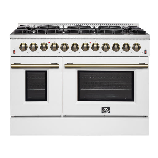 FORNOThe Galiano 48" Dual Fuel Range blends professional style and performance in elegant white with antique brass accessories. Featuring eight sealed b...